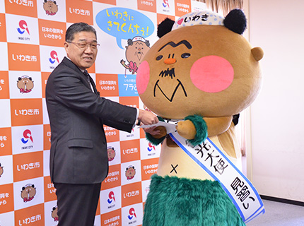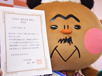 フラおじさんが「IWAKI 観光大使 見習い」任命式されました!写真は、その任命式の様子です。